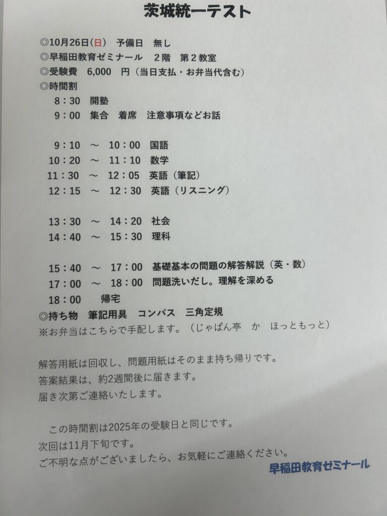 インスタ、HPにて茨城統一テスト実施日を更新します。